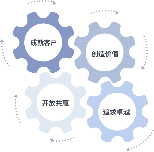 成就客户是一切决策的出发点,,创造价值是衡量所有工作的标准,,,,追求卓越是我们做事做人的态度,,,开放共赢是我们的格局也是最终的结果。。。。价值观的齿轮环环相扣,,推动着组织里的每个人不断向前。。。。